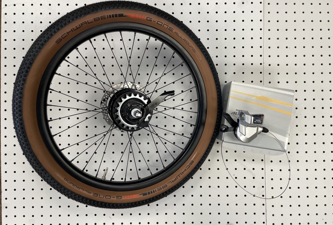 The upgrade concept is very simple. Instead of the standard Shimano Alfine 8 hub, we build a wheel using your original rim combined with a Shimano Alfine 11 hub. You simply replace the entire rear wheel and swap the 8-speed shifter for the 11-speed one. Everything is included in the kit, including the Cassette Joint for Alfine 11. After that, you perform a very simple gear adjustment — and you’re ready to ride!